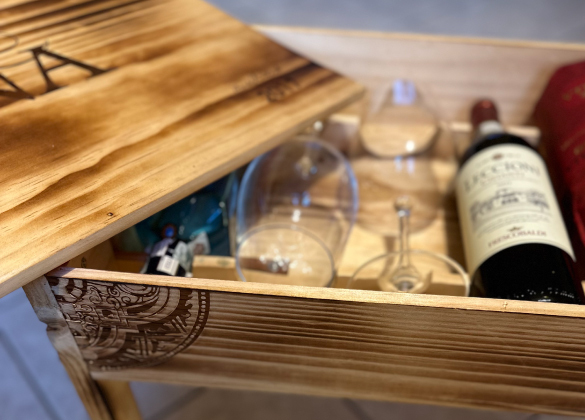 Rendi unico il tuo tavolino in cassette di vino personalizzandolo con il logo della tua azienda! Grazie alla sua eleganza e robustezza, questo pezzo artigianale sarà il regalo perfetto per i tuoi dipendenti, clienti o collaboratori.